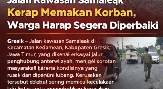 Mediacentral.info-Gresik – Jalan kawasan Samaleak di Kecamatan Kedamean,diruas Kabupaten Gresik, Jawa Timur, yang dikenal sebagai jalur penghubung antarwilayah, menjadi sorotan masyarakat karena