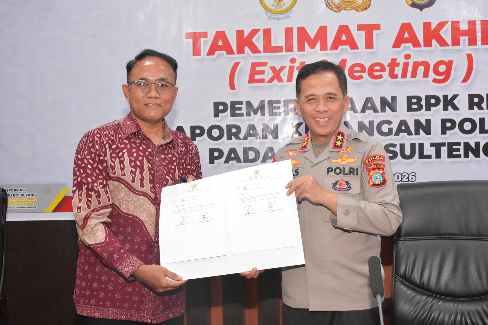 Menutup kegiatan tersebut, acara dirangkaikan dengan penandatanganan berita acara sebagai tanda resmi berakhirnya pemeriksaan Laporan Keuangan Polri T.A. 2025 oleh Tim BPK RI di jajaran Polda Sulteng.