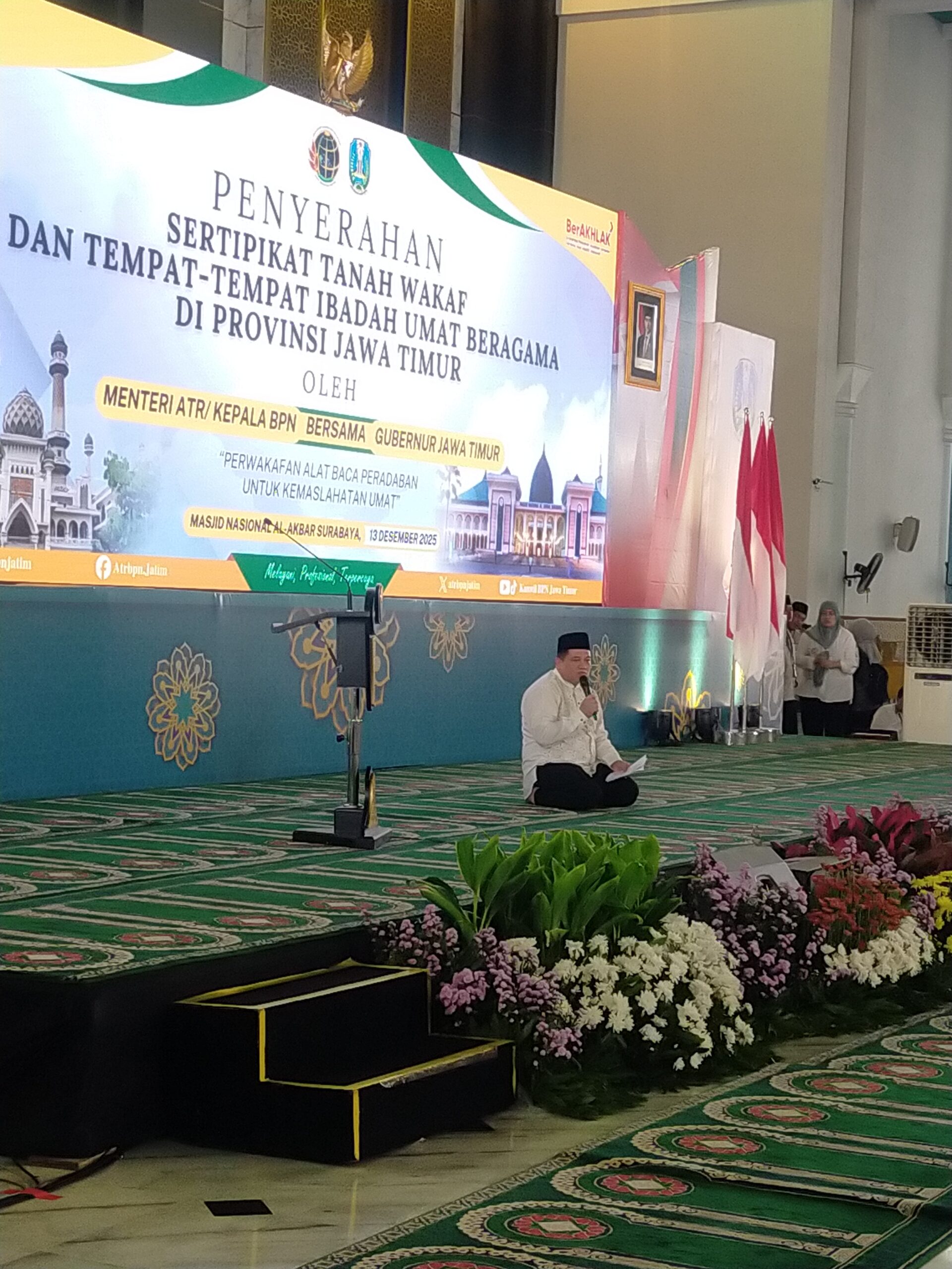 Surabaya — Badan Pertanahan Nasional (BPN) bersama Pemerintah Provinsi Jawa Timur menggelar kegiatan Penyerahan Sertipikat Wakaf dan Tempat Ibadah dengan jumlah total 2.532 sertipikat. Kegiatan ini dilaksanakan di Masjid Nasional Al Akbar Surabaya, Jalan Masjid Al Akbar.