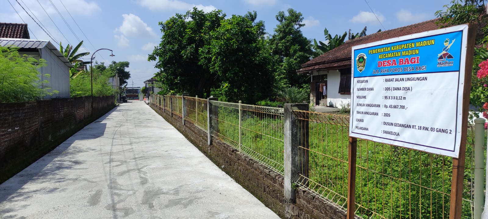 Media Centrall Madiun, Demi mewujudkan program pembangunan infrastruktur, Pemerintah Desa Bagi, Kecamatan Madiun Kabupaten Madiun, Jatim sukses merealisasikan pembangunan jalan rabat beton dengan volume 95 x 3 x 0.12 Meter, di Dusun Gedangan, RT 18 RW 03 Gang 02 Dusun Gedangan.
