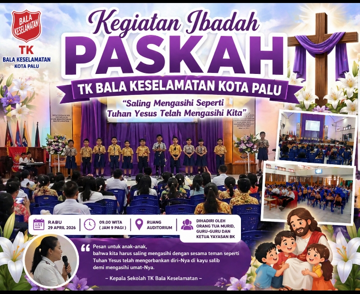 Mediacentral-Palu, 29 April 2026 — Suasana penuh sukacita dan kebersamaan mewarnai kegiatan Ibadah Paskah yang diselenggarakan oleh TK Bala Keselamatan (BK) Kota Palu pada Rabu pagi (29/4/2026), bertempat di ruang auditorium mulai pukul 09.00