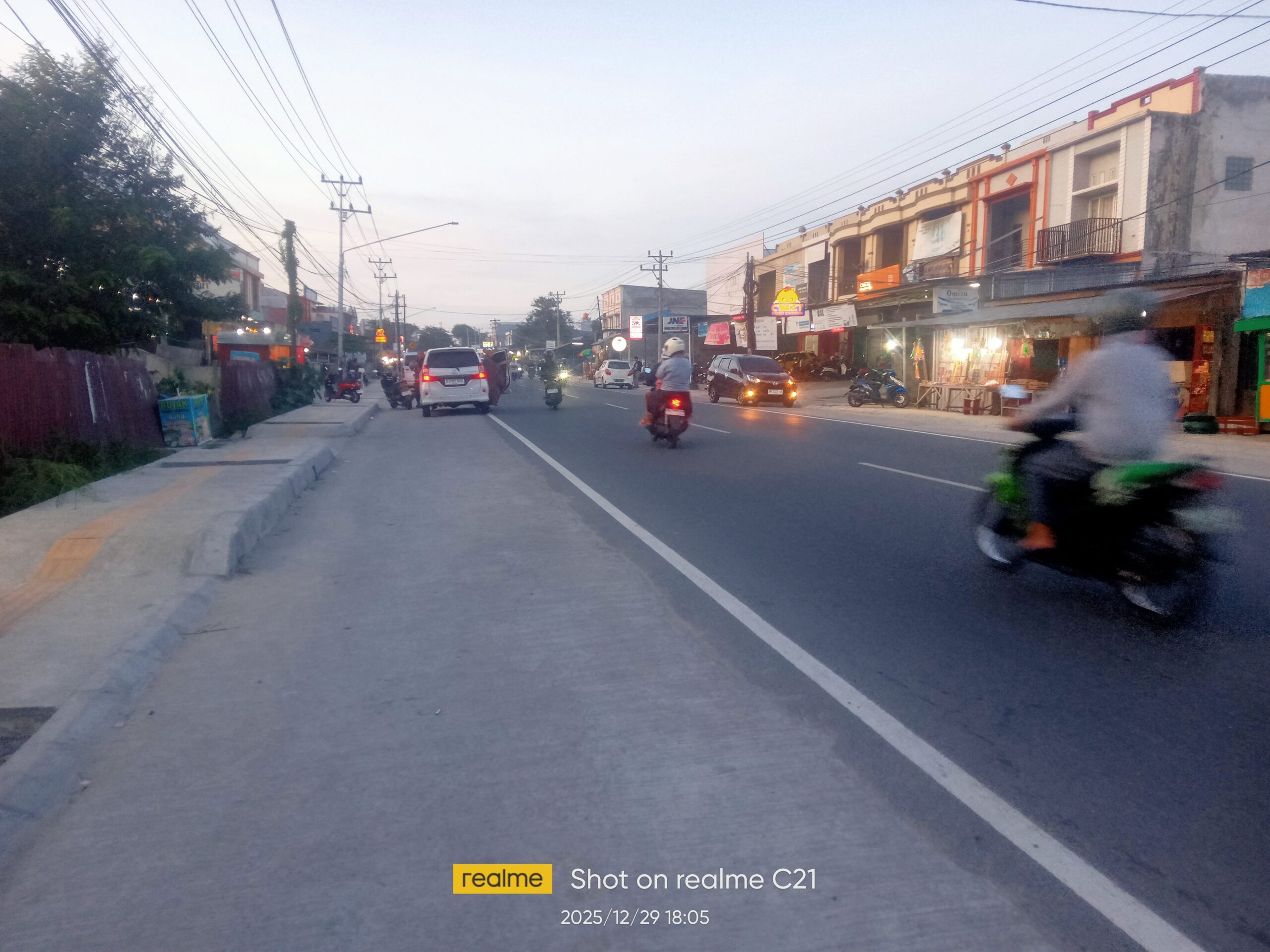 Marka jalan yang masih terlihat baru, lengkap dengan zebra cross yang tertata rapi, menambah estetika kawasan tersebut. Lampu-lampu toko dan kendaraan yang melintas menciptakan nuansa hangat di bawah langit senja yang berawan. Beberapa warga terlihat berkumpul di depan pertokoan, sementara kendaraan roda dua dan empat lalu lalang dengan tertib.