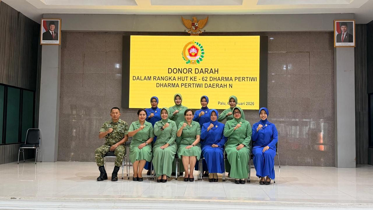 Media Central, Palu — Kodam XXIII/Palaka Wira bersama Persit Kartika Chandra Kirana PD XXIII/Palaka Wira menggelar kegiatan donor darah dalam rangka memperingati HUT ke-62 Dharma Pertiwi, dan HUT ke-80 Persit Kartika Chandra Kirana, Jumat (6/2/2026).