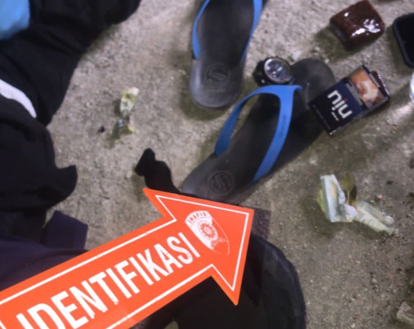 Tak lama kemudian, aparat Polsek Palu Selatan bersama Unit Identifikasi Satreskrim Polresta Palu tiba di lokasi, memasang garis polisi, dan melakukan olah tempat kejadian perkara (TKP). Dari hasil olah TKP, petugas menemukan sebuah tas pinggang berisi dompet, handphone, dan alat hisap bong.