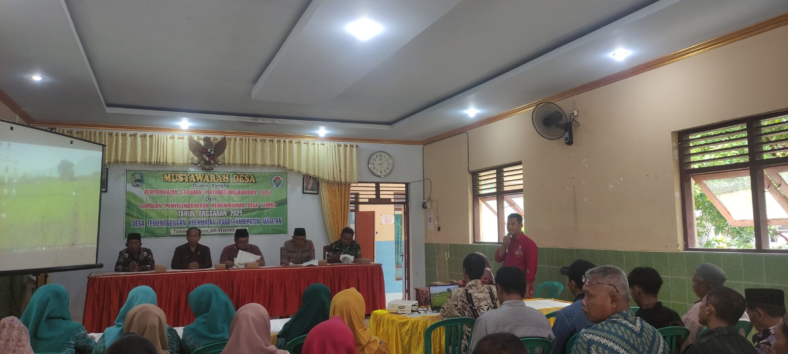 Media Central Magetan, Berlangsung di gedung pertemuan, Kamis (26/3/2026) Pemerintah Desa Temenggungan Kecamatan Karas Kabupaten Magetan Jatim, sukses melaksanakan kegiatan MusDes Penyampaian Laporan Pertanggungjawaban (LPJ) dan Laporan Penyelenggaraan Pemerintah Desa (LPPD) TA 2025.