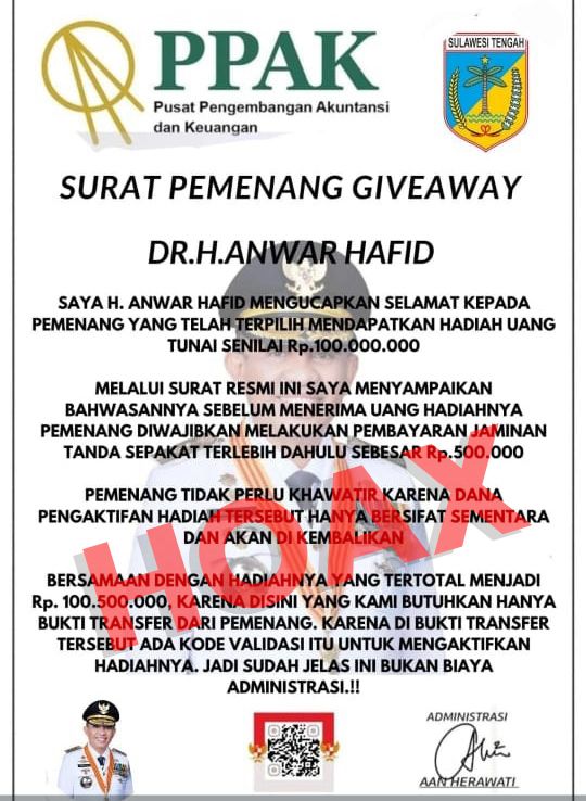 Media Central, Palu – Beredar unggahan di media sosial (medsos) yang mencatut nama Gubernur Sulawesi Tengah Dr. H. Anwar Hafid, M.Si, mengucapkan selamat kepada pemenang giveaway dengan hadiah uang tunai sebesar 100 juta rupiah.