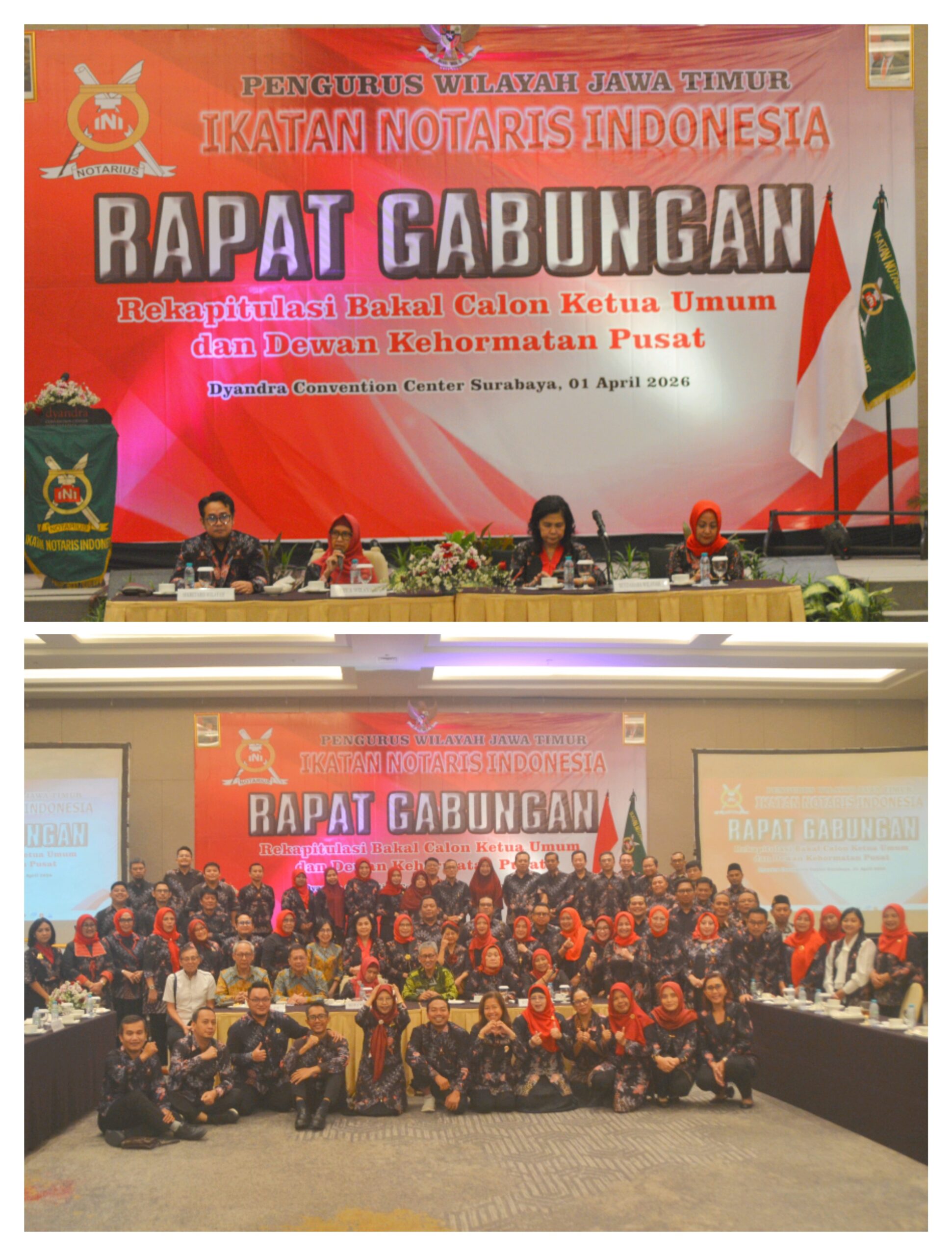 Surabaya- Pengurus Wilayah Jawa Timur Ikatan Notaris Indonesia (INI) menggelar rapat gabungan di Dyandra Convention Center pada Kamis, 1 April 2026. Agenda utama dalam kegiatan ini adalah rekapitulasi bakal calon Ketua Umum serta Dewan Kehormatan Pusat sebagai bagian dari tahapan penting dalam proses pemilihan kepemimpinan organisasi.