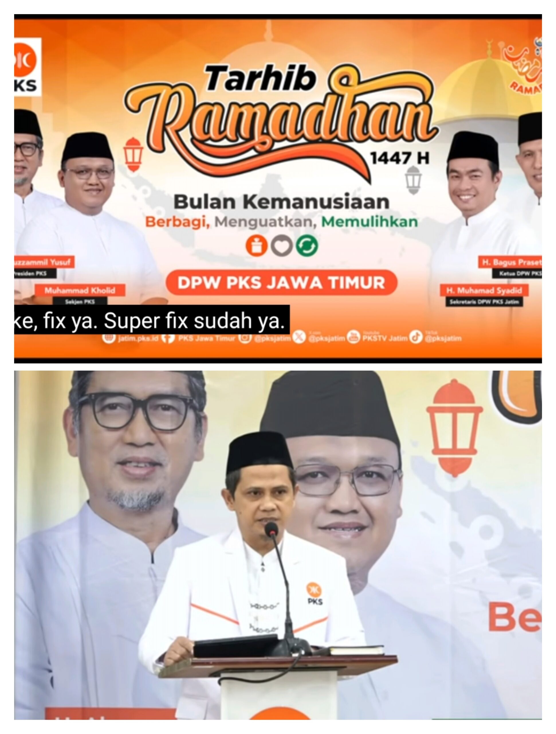 Kegiatan Tarhib Ramadan ini menghadirkan jajaran pimpinan PKS, di antaranya Presiden PKS Almuzammil Yusuf, Sekretaris Jenderal PKS Muhammad Kholid, Ketua DPW PKS Jawa Timur Bagus Prasetyo Lilono, serta Sekretaris DPW PKS Jawa Timur Muhamad Syadid.