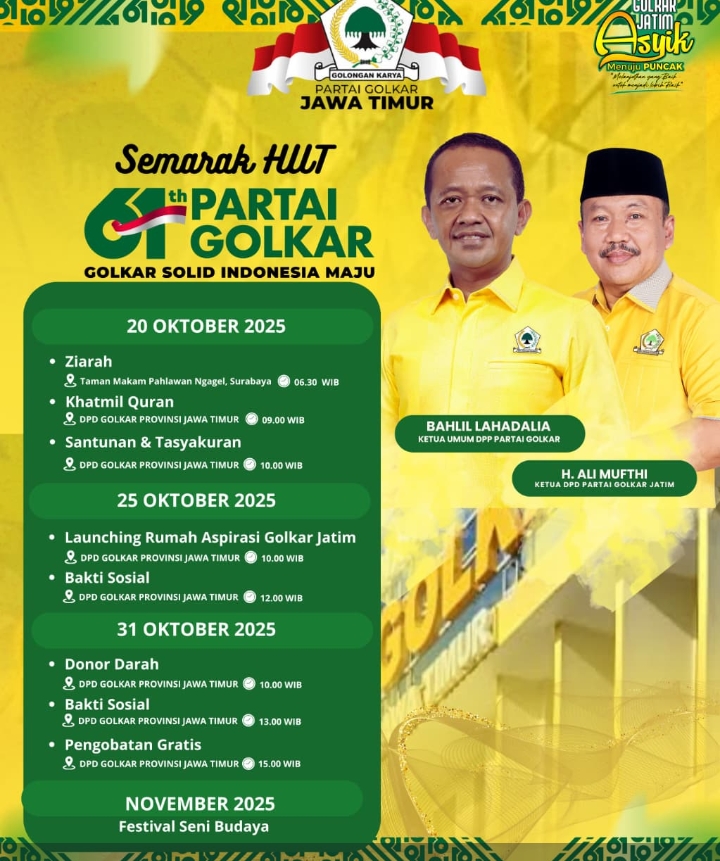 MC, Surabaya, Oktober 2025 – Dalam rangka memperingati Hari Ulang Tahun (HUT) ke-61 Partai Golkar, Dewan Pimpinan Daerah (DPD) Partai Golkar Provinsi Jawa Timur menggelar serangkaian kegiatan bertajuk “Semarak HUT ke-61 Partai Golkar: Golkar Solid Indonesia Maju.” Rangkaian acara berlangsung sepanjang bulan Oktober hingga November 2025, dengan beragam kegiatan sosial, keagamaan, dan kebudayaan.
